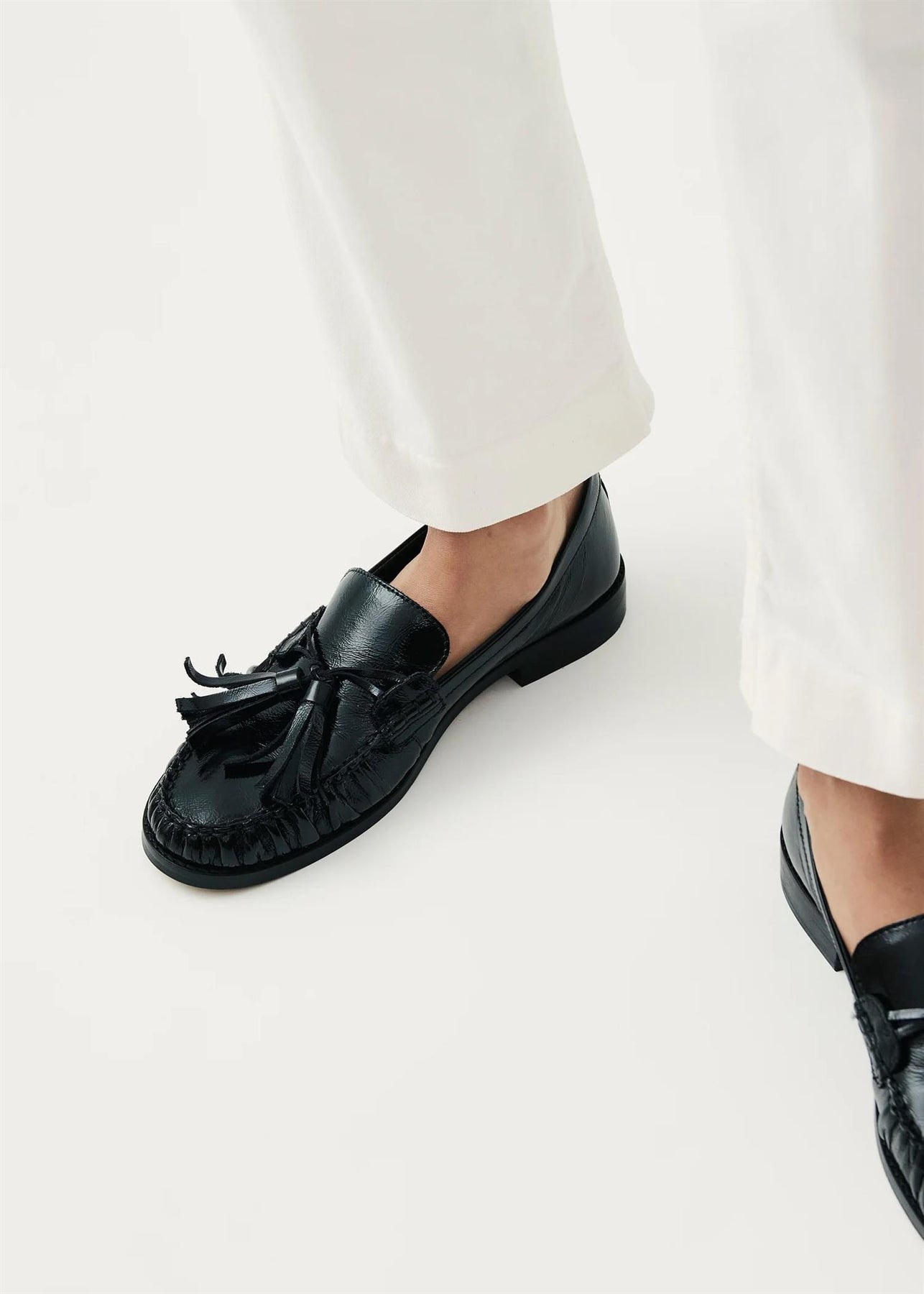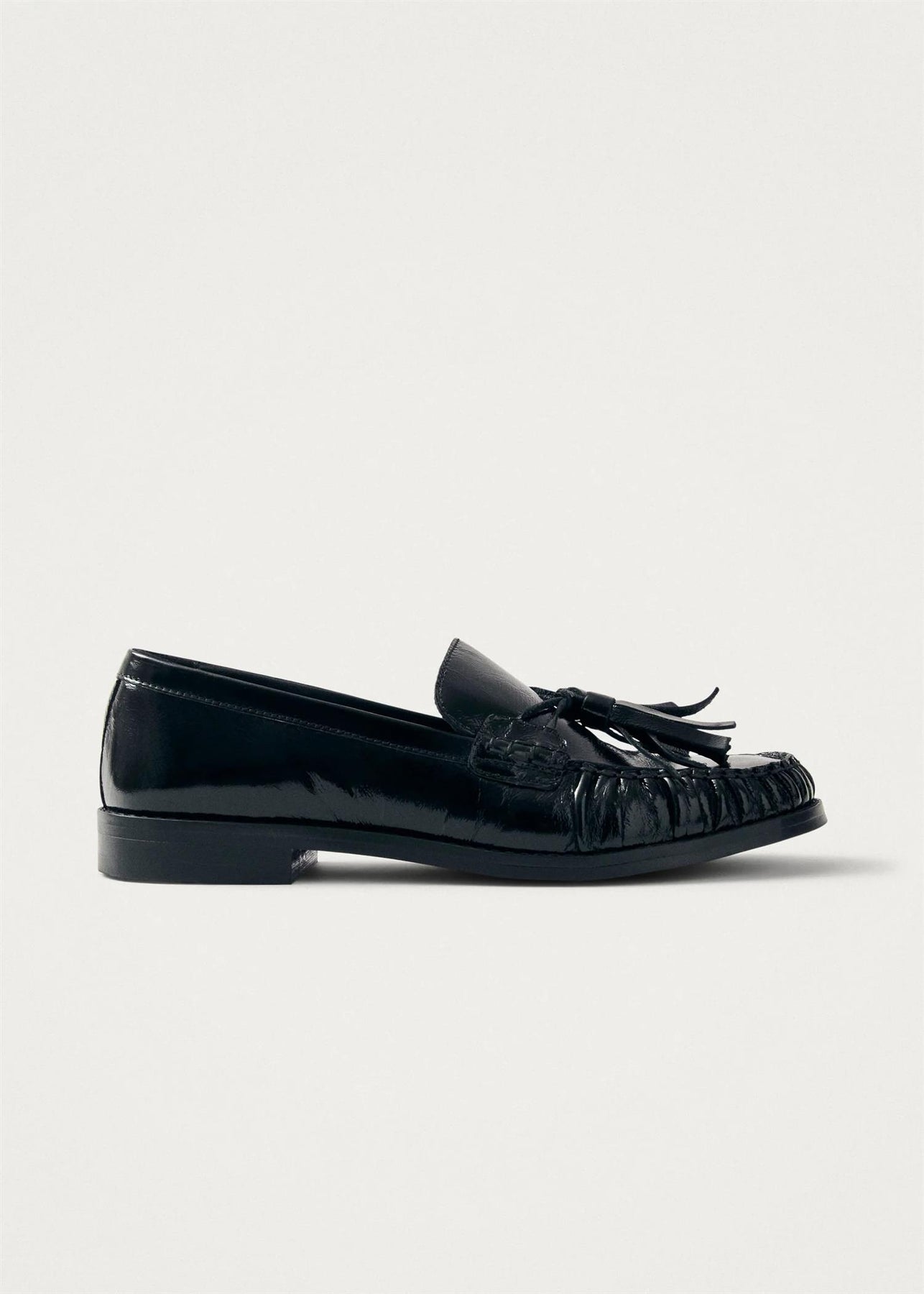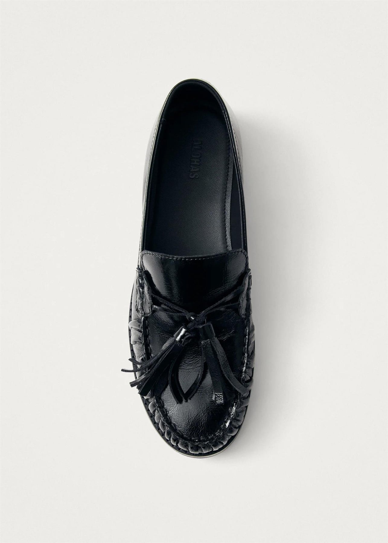 Black patent leather loafers with tassels
